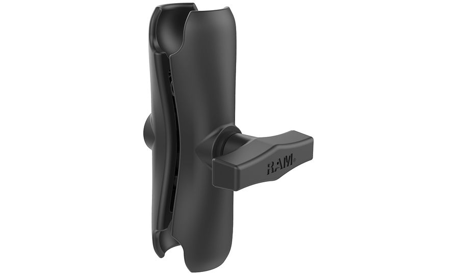 ArmRAM-201U mit Klemmen an beiden Enden. Die Feder und die Spannschraube am Arm ermöglichen eine schnelle und sehr feste Befestigung an den 1,5"-Bolzen.